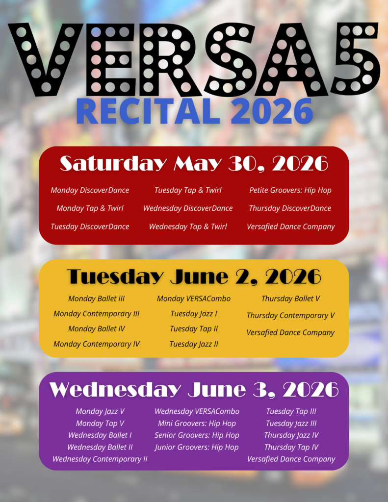 We are beyond excited to announce our annual recital, VERSA5 on BROADWAY: Dancing Through Life! This year’s recital will shine bright with a Broadway-themed show, celebrating all the magic, ballads, and storytelling of the stage!